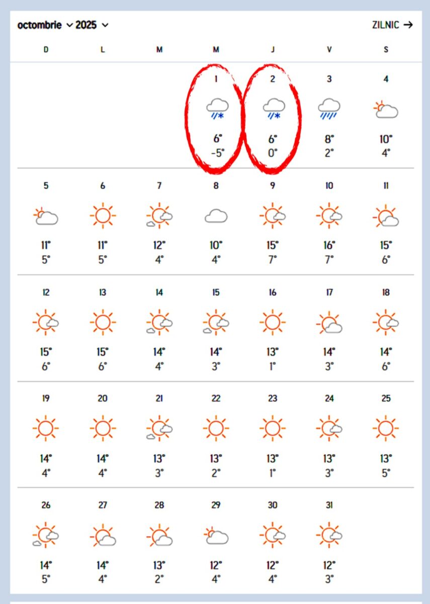 A doua jumătate a lunii păstrează aceeași tendință. Între 19 și 25 octombrie, soarele domină din nou prognoza, cu valori maxime de 13-14 grade și nopți tot mai reci. Finalul de lună, 26-31 octombrie, aduce temperaturi ușor mai scăzute, maxime de 12-14 grade, dar în continuare mult soare și foarte puține zile înnorate.